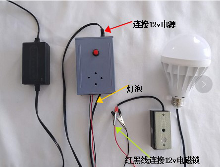 连线说明 1.控制器接12V电源; 2.控制器上的红黑线输出12V,红线接电磁锁的红线,黑线接电磁锁的黑线;
